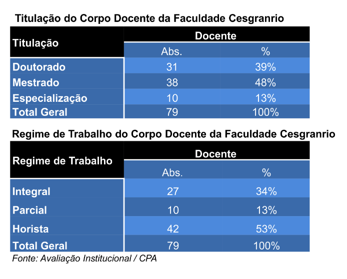 A Diretoria Acadêmica gerencia o corpo docente da FACULDADE. Em 2020 apresentou um efetivo de 79 professores, sendo 87% mestres ou doutores e 47% contratados em regime de tempo parcial ou integral.